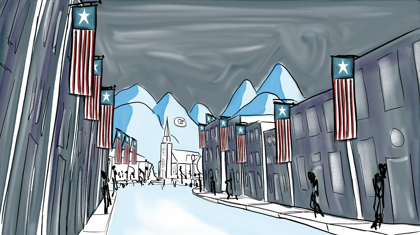 (She looks again across the way towards Seamus’ direction but now her eyes drift up towards the “G” on the mountain)
