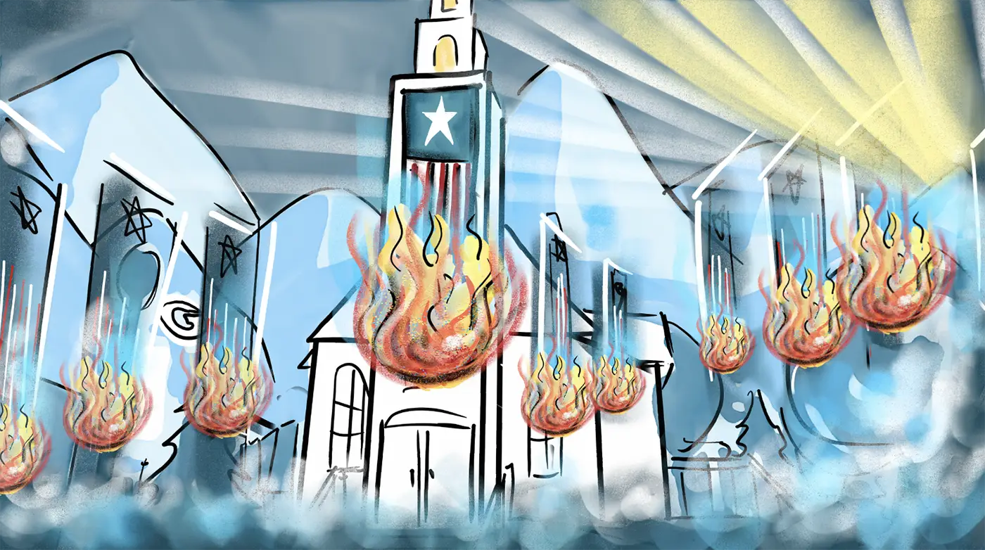 (The authoritarian MPS flags all fall from the church and are devoured by some kind of fire and wind)