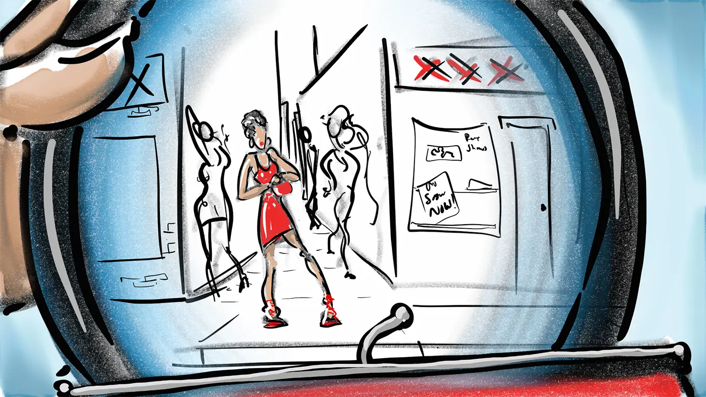 (Pulls a pocket mirror up from her little clutch as if looking back at her old self on the streets)